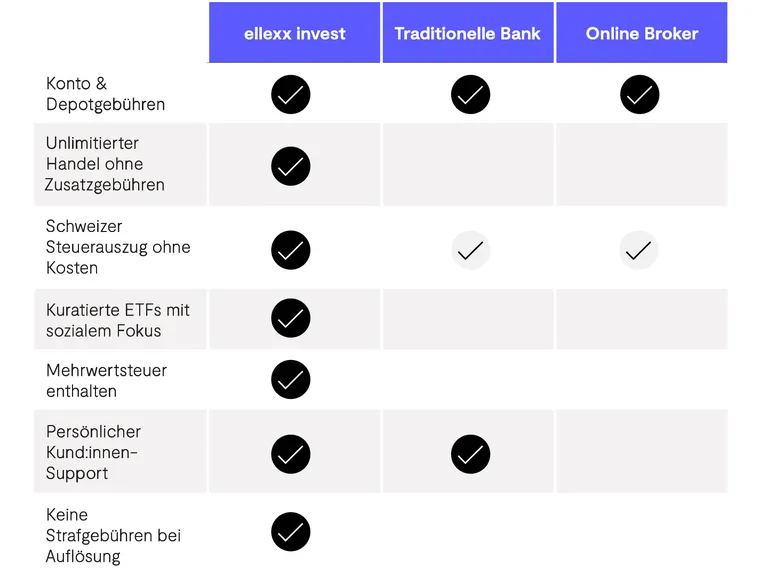 - Zugänglich: Investiere schon mit kleinen Beträgen – digital und ohne Hürden. Bei ellexx invest kannst du mit CHF 1’500 starten.