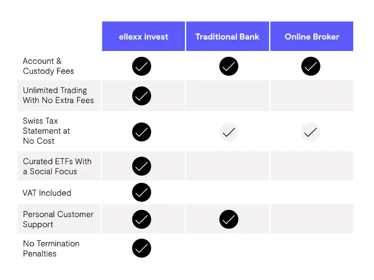 - Fair: A transparent flat fee with no hidden costs. With ellexx invest, investing is worthwhile even with small monthly amounts, because we don’t charge additional trading fees. Compared to traditional banks, you benefit from significantly lower fees and access to low-cost ETFs.